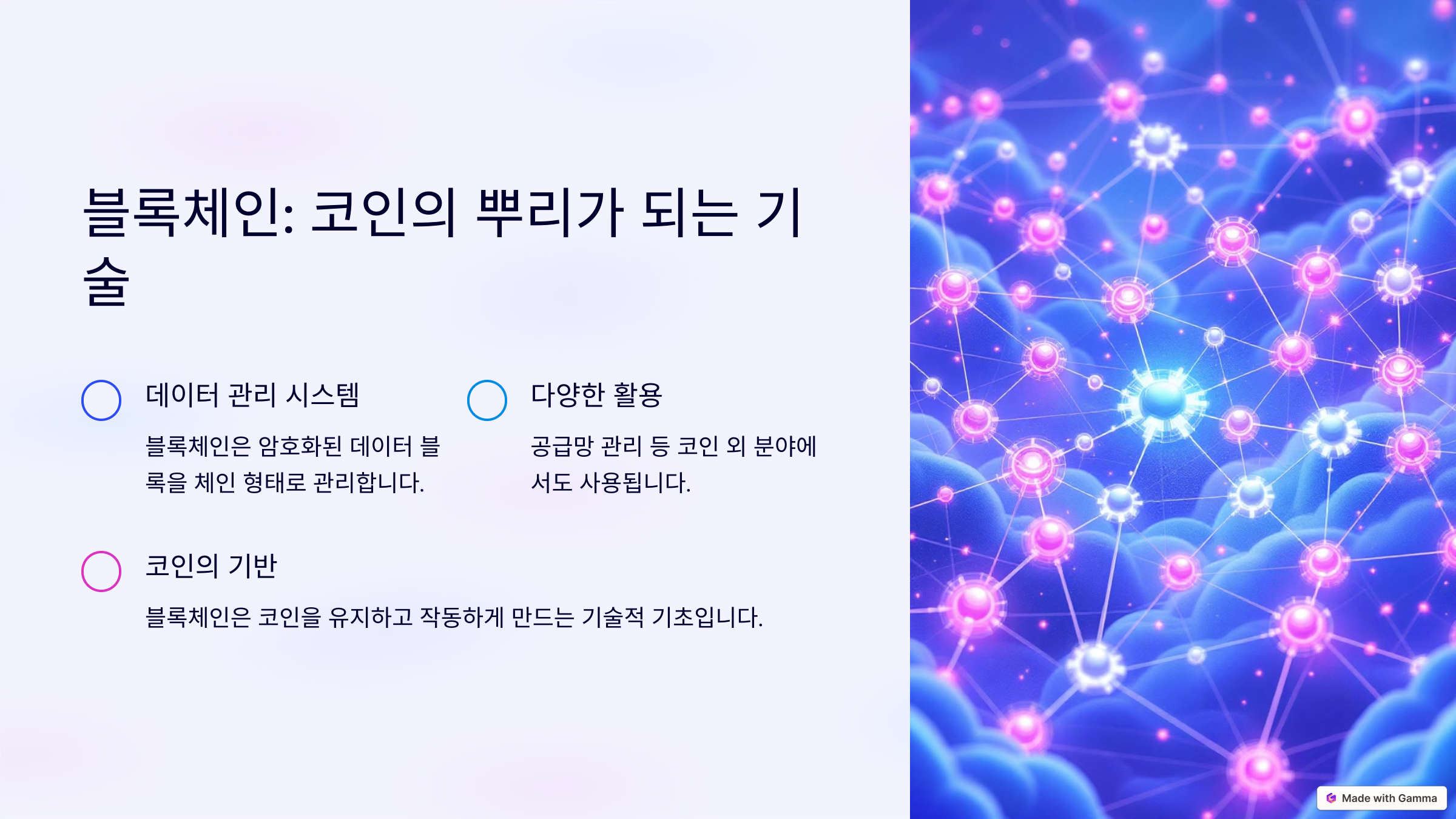 블록체인은 마치 잘 짜인 거미줄 같다고 할 수 있습니다. 정보를 저장하는 네트워크로, 각각의 노드가 연결된 이 기술은 암호화된 데이터 블록을 체인 형태로 묶어 관리합니다. 간단히 말해, 블록체인은 데이터를 안전하게 기록하고 누구도 변조할 수 없게 만드는 시스템입니다.