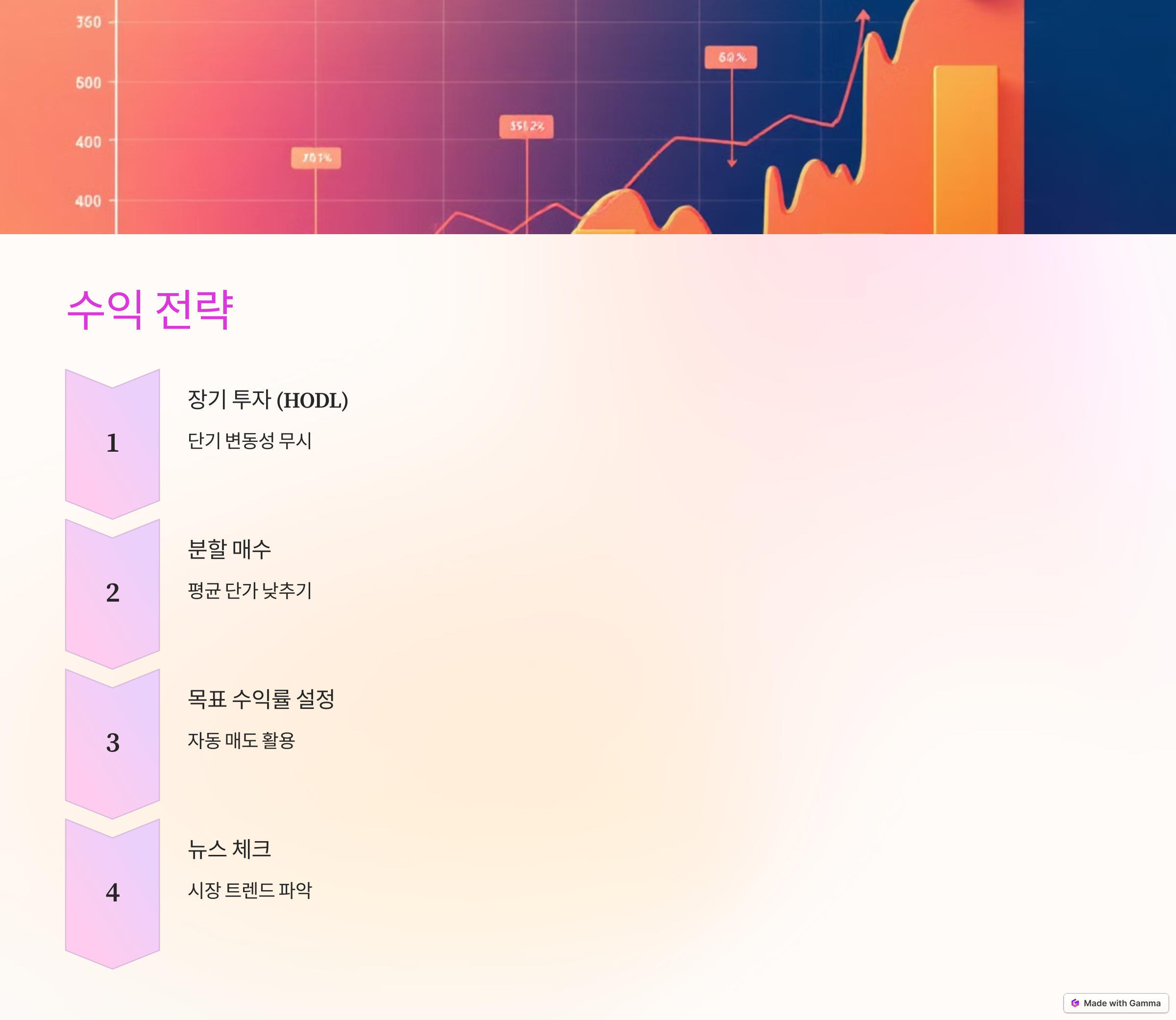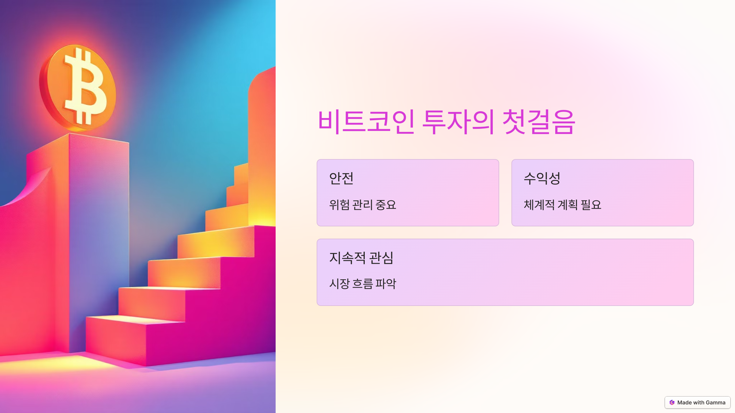 비트코인 투자는 초보자에게 새로운 도전이 될 수 있지만, 올바른 정보와 전략만 있다면 충분히 성공할 수 있는 기회입니다. 중요한 것은 "안전", "수익성", "계획"이라는 세 가지 핵심 원칙을 지키며, 시장의 흐름에 꾸준히 관심을 기울이는 것입니다. 이제 당신도 비트코인 시장에 첫발을 내디뎌보세요. 작은 시작이 큰 결과를 가져다줄 수 있습니다!