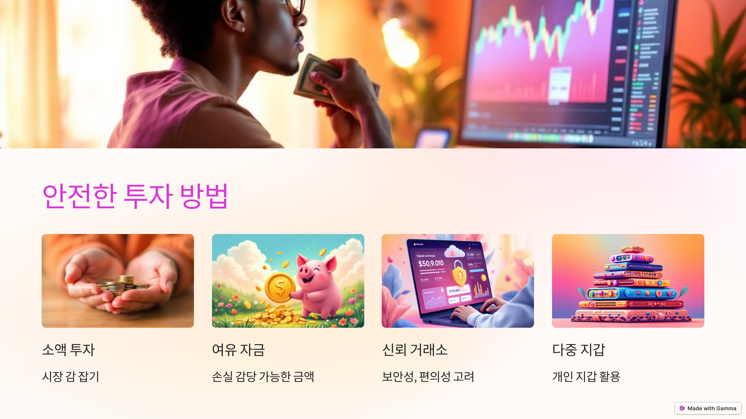 비트코인 투자는 고수익이 가능한 만큼 높은 위험을 동반합니다. 초보자라면 특히 "안전"에 초점을 맞춰야 합니다. 다음은 안전하게 투자할 수 있는 몇 가지 팁입니다: