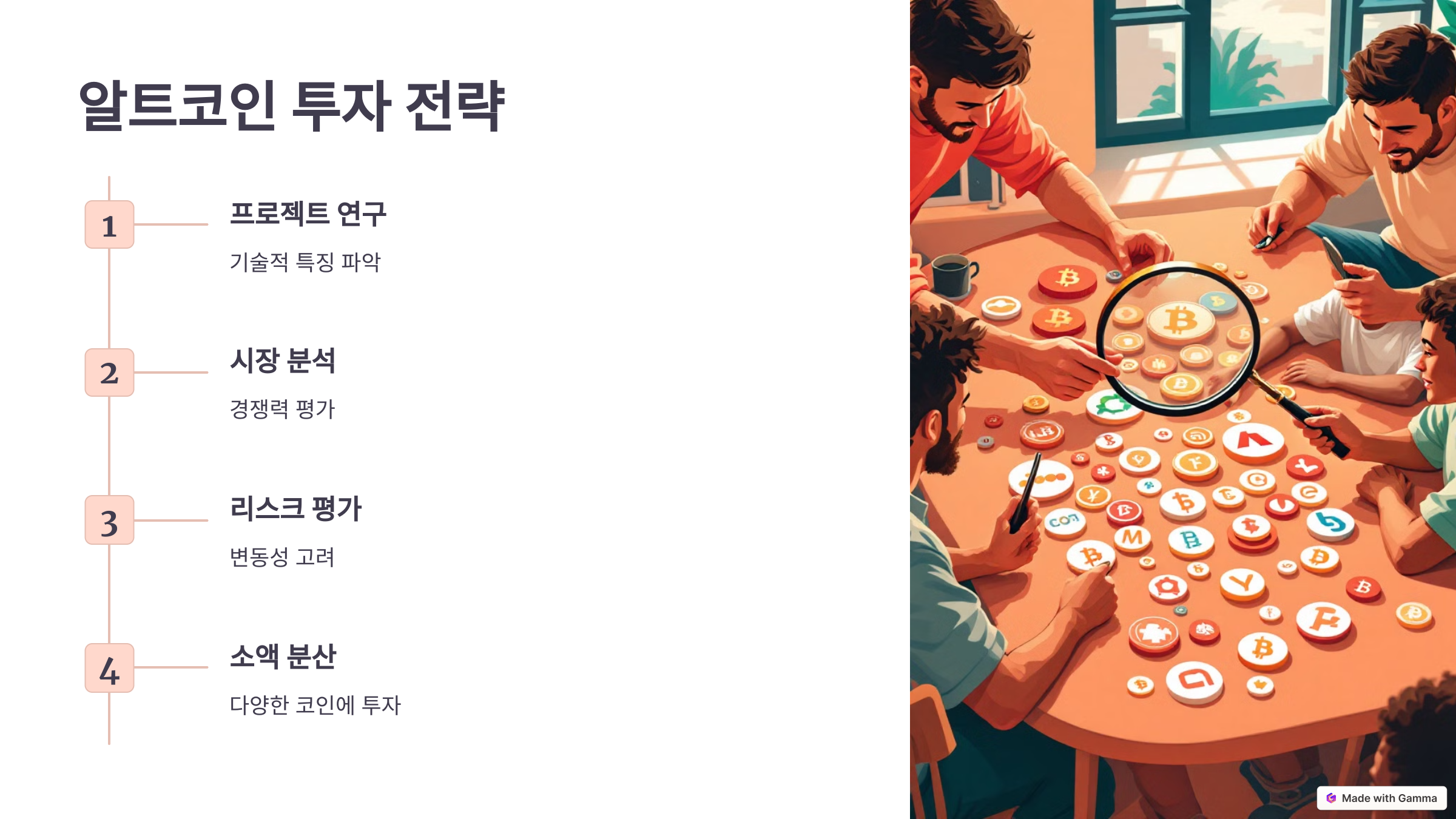 이더리움은 비교적 안정적인 투자 자산으로 여겨지지만, 알트코인은 리스크가 높은 만큼 분산 투자를 통해 위험을 줄이는 것이 중요합니다. 여러 프로젝트에 소액으로 나누어 투자하며, 항상 시장의 흐름을 관찰하세요.