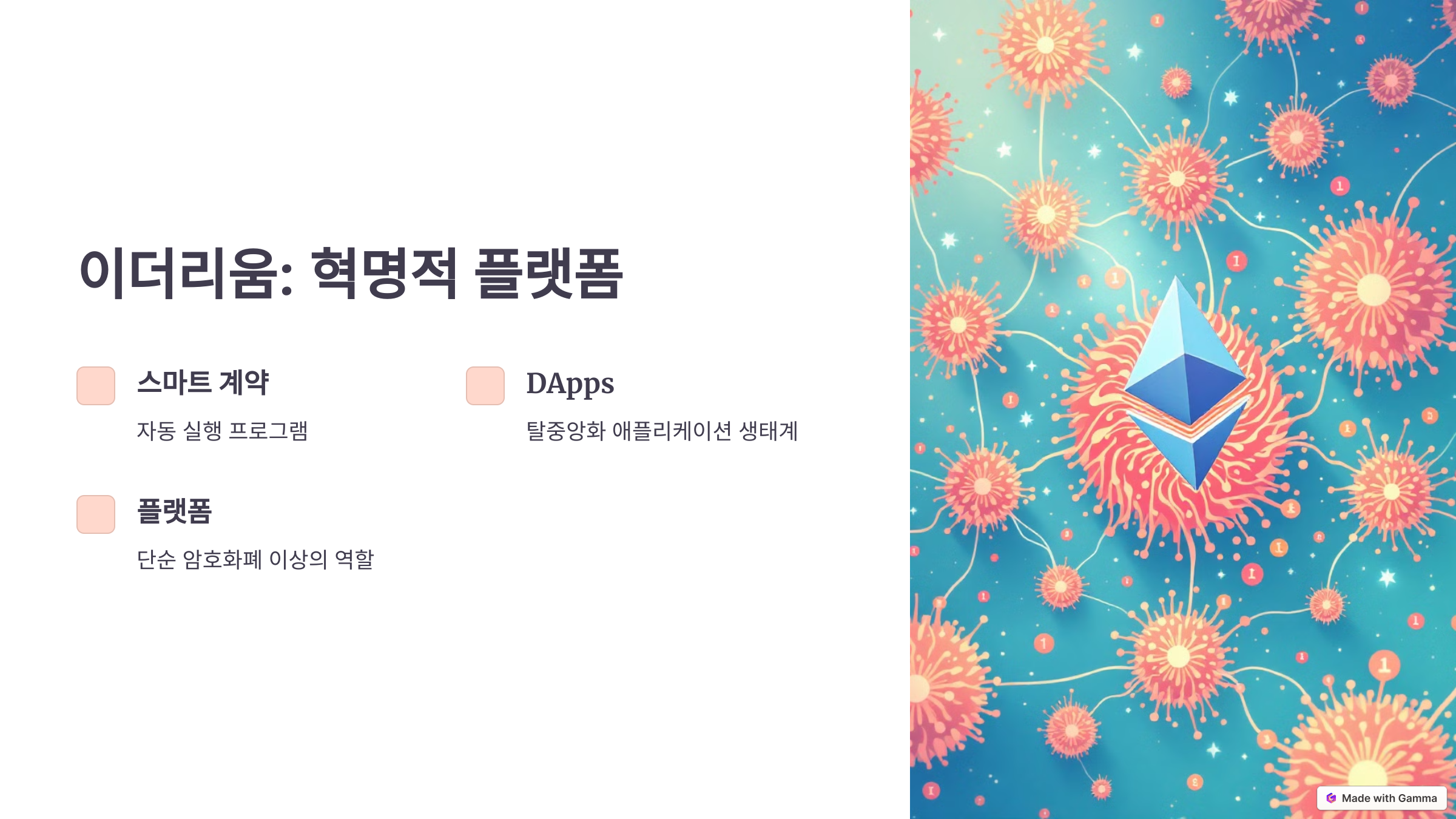 스마트 계약을 기반으로 만들어진 이더리움 생태계는 수많은 탈중앙화 애플리케이션(DApps)을 탄생시켰습니다. 예를 들어, 디파이(DeFi, 탈중앙화 금융), NFT(대체 불가능 토큰), 게임 등 다양한 산업이 이더리움을 기반으로 작동하고 있습니다. 이러한 점은 이더리움을 단순한 암호화폐를 넘어 하나의 플랫폼으로 자리잡게 만든 핵심 요인 중 하나입니다.