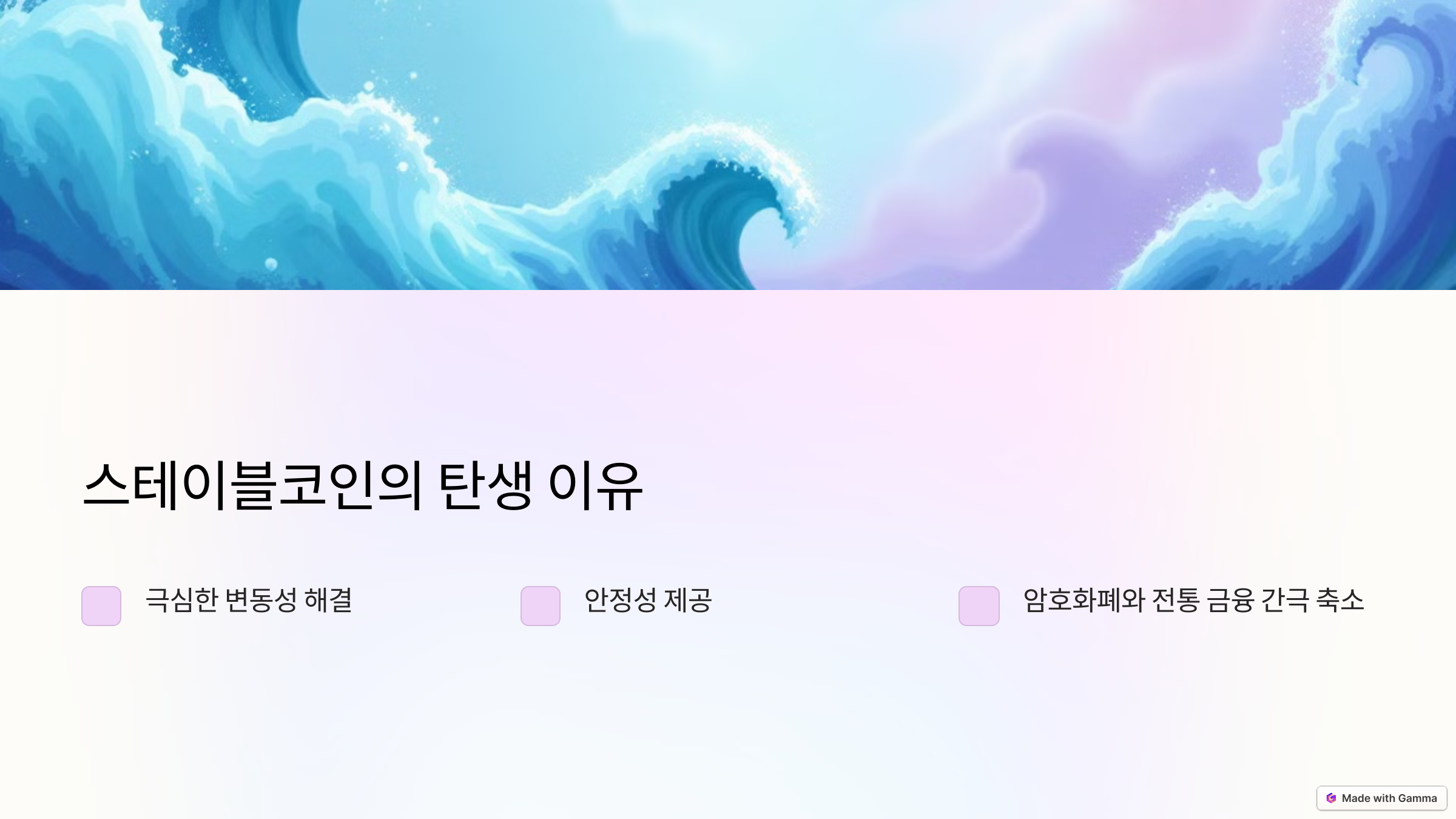 스테이블 코인은 왜 생겨났을까요? 그 답은 간단합니다. 암호화폐의 극심한 변동성을 해결하기 위해서입니다. 비트코인이나 이더리움처럼 가치가 극단적으로 변동하는 자산은 투자자들에게 많은 기회를 제공하지만, 동시에 높은 리스크를 동반합니다. 스테이블코인은 여기서 한 가지 중요한 역할을 맡습니다. '안정성'이라는 가치를 통해 암호화폐와 전통 금융의 간극을 좁히고, 투자자들이 위험을 줄이며 디지털 자산에 접근할 수 있도록 합니다.