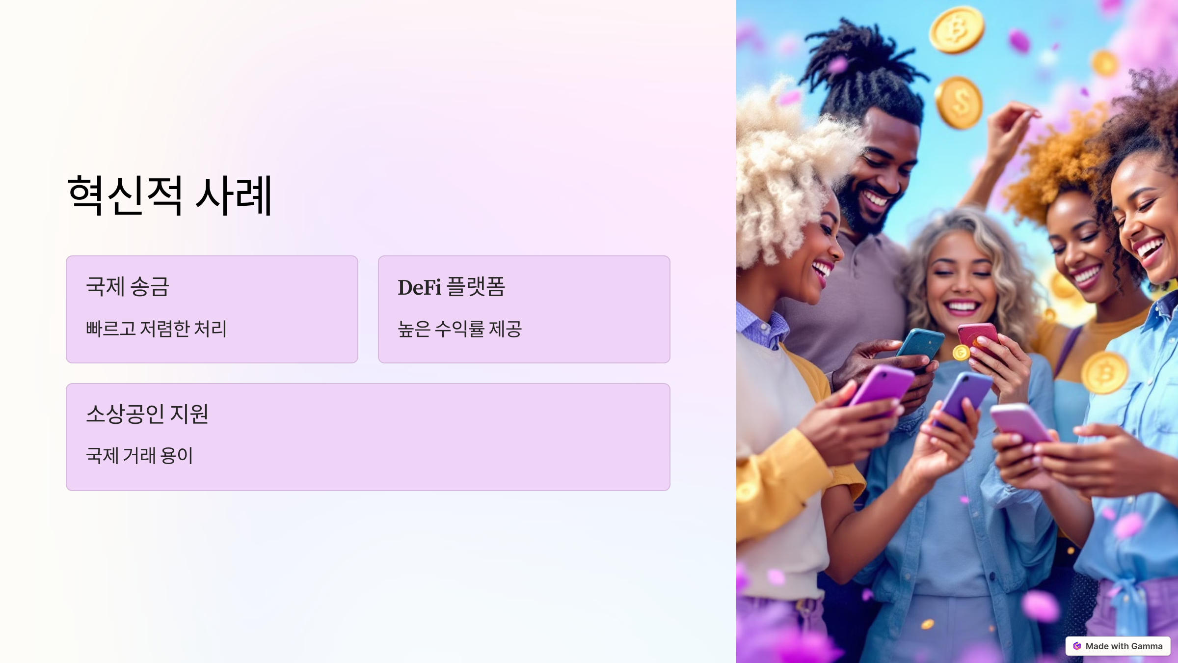 가장 큰 혁신 중 하나는 국경 간 결제입니다. 스테이블코인을 활용하면 은행 시스템을 거치지 않고도 빠르고 저렴하게 국제 송금을 할 수 있습니다. 예를 들어, 전통적인 송금 방식은 높은 수수료와 며칠이 걸리는 처리 시간을 요구하지만, 스테이블코인은 이를 몇 분 내로 처리하며 비용도 낮출 수 있습니다. 실제로 많은 글로벌 기업들은 이를 통해 거래 비용을 절감하고 있습니다.