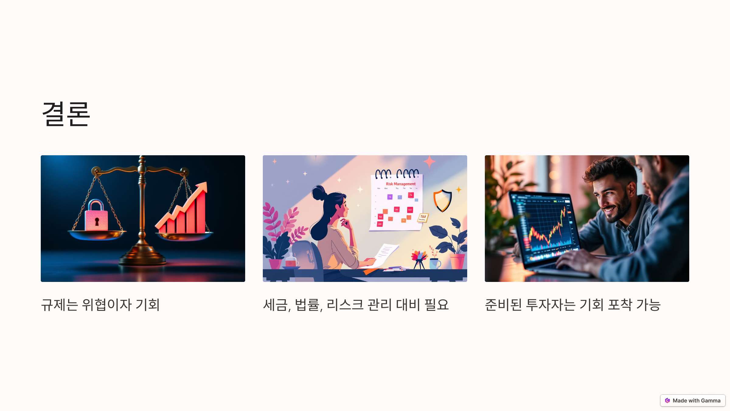 암호화폐 시장은 여전히 많은 가능성을 품고 있습니다. 규제가 변하더라도, 준비된 투자자는 항상 기회를 잡을 수 있습니다. 여러분은 규제에 준비되어 있나요? 그렇다면, 이제 한 단계 더 성장할 준비를 하세요. 😊